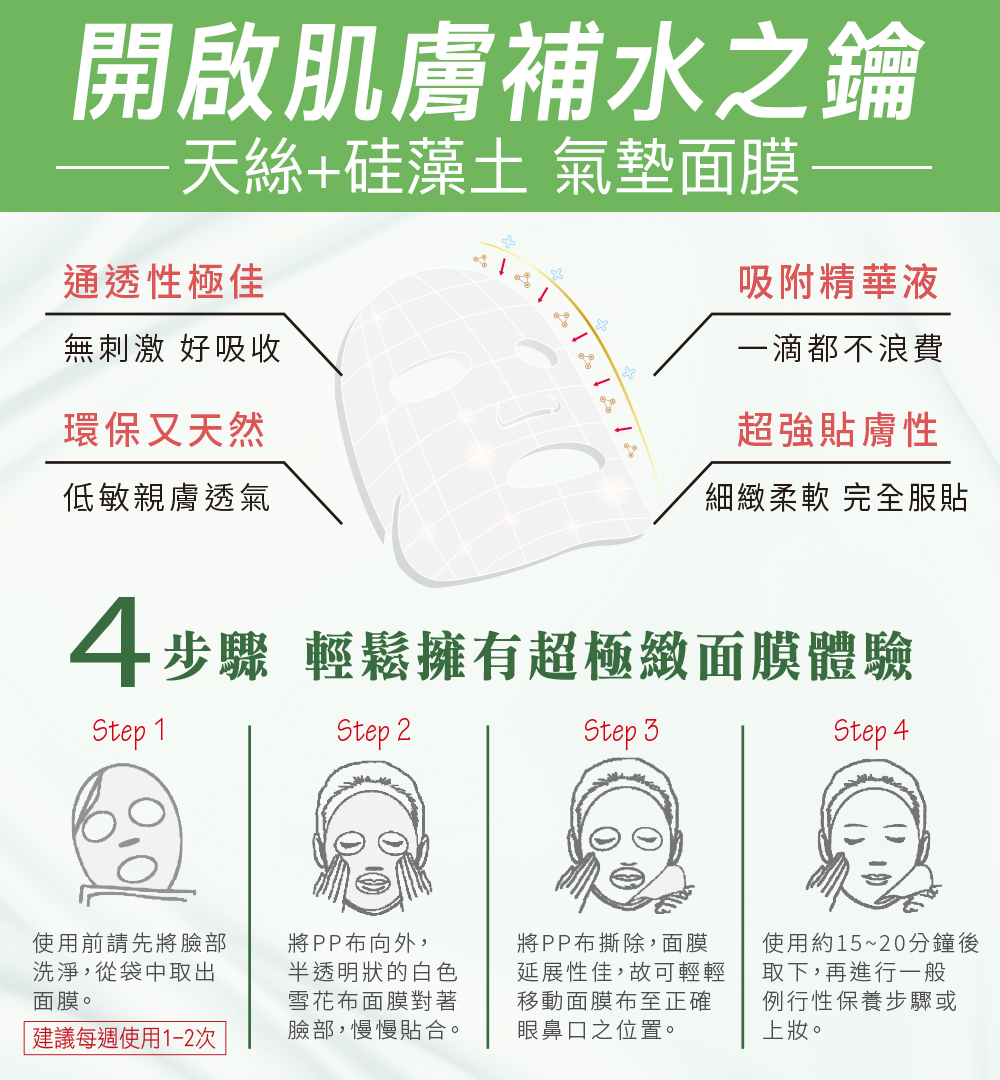 天絲+硅藻土氣墊面膜,柔軟服貼高滲透